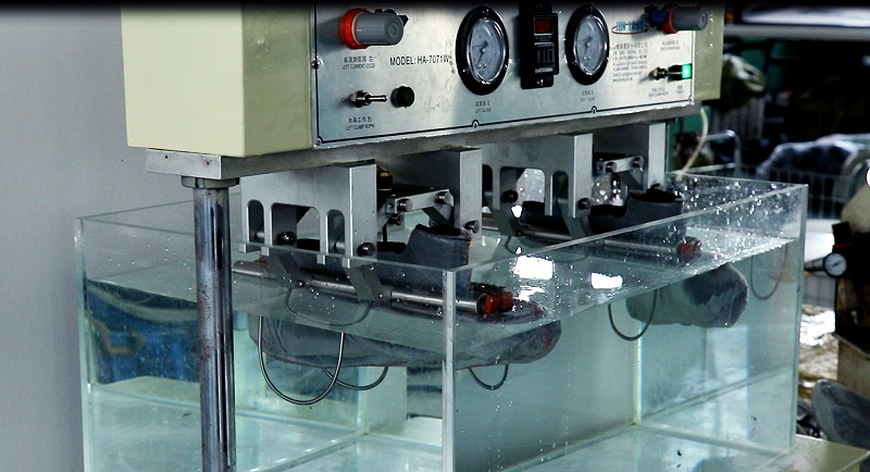 成品鞋防水测试分为动态防水测试和静态防水测试。动态防水测试,通过模仿人脚弯曲行走的状态,把鞋子放在水里进行曲折测试,动态防水15000次不透水。将成品鞋装在防水性能试验机上,试验机的水箱里放入一定深度的水与鞋接触,试验机以一定角度和频率推动鞋的前掌弯曲模拟行走状态进行试验,测定水从鞋外透进鞋内所需的弯曲次数或时间;静态防水测试,在成品鞋内注水观察24小时不漏水。